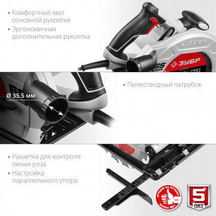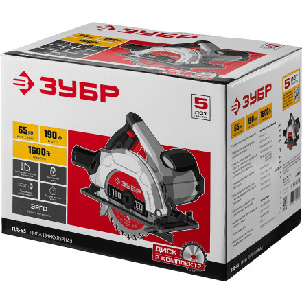 Циркулярная пила (дисковая) Зубр, пропил 90гр-65 мм, диск 190мм, 1600 Вт ПД-65