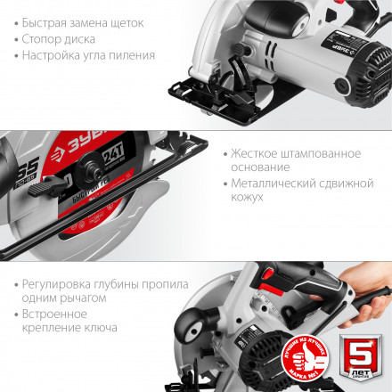 - Бесступенчатая регулировка глубины и угла пиления для точных работ