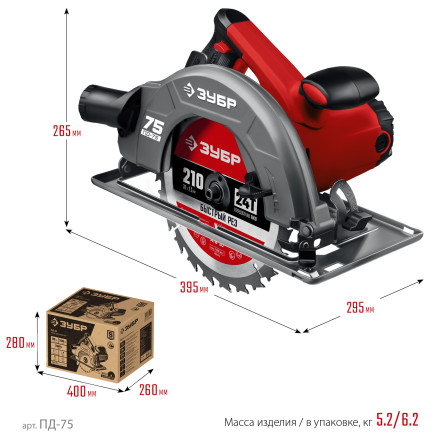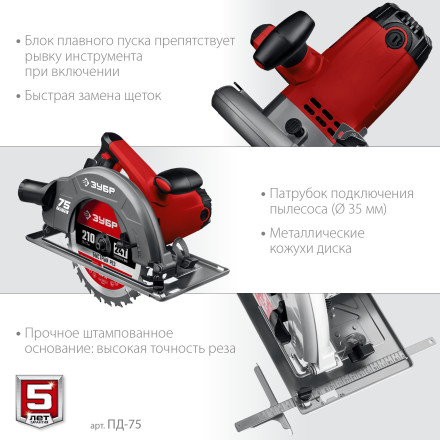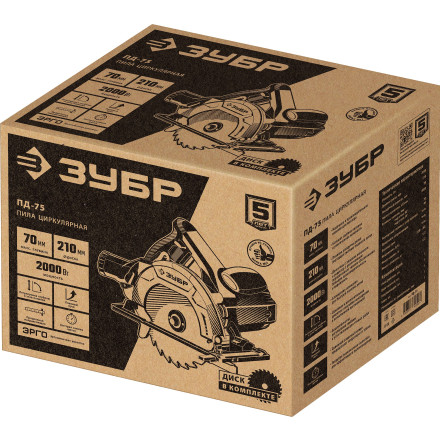 Циркулярная пила (дисковая) Зубр, пропил 90гр-70 мм, диск 210мм, 2000 Вт ПД-75