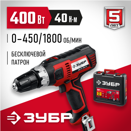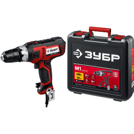 - Дрель-шуруповерт сетевая Зубр 400 Вт, 40 Н·м, кейс (ДШ-М1-400-2 К)