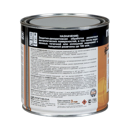 Состав: модифицированная алкидная смола, восстановитель металла, ингибитор коррозии, пигменты, наполнитель, антикоррозионные и функциональные добавки, растворитель;