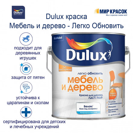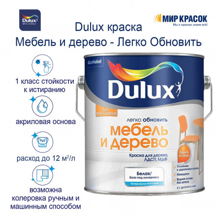- Краска грунт для дерева DULUX ЛЕГКО ОБНОВИТЬ МЕБЕЛЬ И ДЕРЕВО, ЛДСП, МДФ, матовая, база BW 0,75л