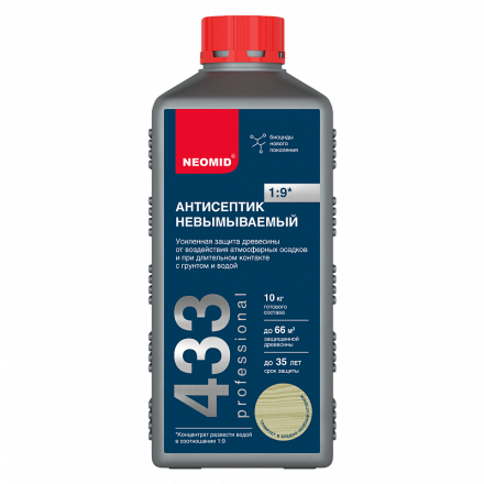 NEOMID 433 Антисептик Невымываемый Усиленный — консервирующий невымываемый антисептик нового поколения для эффективной долговременной защиты различных пород древесины в тяжелых условиях эксплуатации, в том числе при длительном контакте с грунтом и влагой. Классы использования с 1 по 4 (EN 335:2013).