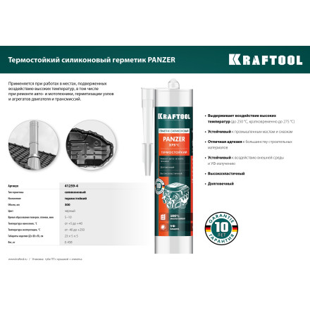 Температуростойкий герметик силиконовый 300мл Kraftool долговечный термостойкий силиконовый материал широкого спектра применения для выполнения профессиональных монтажных работ, например: герметизации соединений, подвергающихся воздействию высоких температур, в автомобильных и промышленных двигателях, в насосах, коробках переключения передач, компрессорах, вентиляционных системах, печах, каминах и многом другом. Состав идеален при использовании в подвижных швах. Герметик быстро затвердевает под действием влажности воздуха, обладает высокой эластичностью и адгезией к большинству материалов (металлы, стекло, древесина, керамика, пластик, окрашенные поверхности). Отличается устойчивостью к влаге, атмосферным воздействиям и химическим веществам. Температура нанесения: от +5 до +40 °С, температура эксплуатации: от -65 до +315 °С.