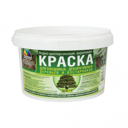 Акриловая краска для садовых и плодовых деревьев производится на водной основе и предназначена для окраски стволов и сучьев плодовых, декоративных деревьев и кустарников в весенний и осенний периоды. Наносить рекомендуется в ранневесенний и осенний периоды, при температуре не ниже + 5 °С. Перед окраской необходимо подготовить поверхность дерева щеткой с твердой щетиной, удалить старую непрочно держащуюся кору.