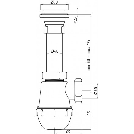 Сифон сливной АНИ пласт A0100 для кухонных моек с диаметром сливного отверстия 50мм, с увеличенным корпусом бутылочного типа, с разборным выпуском, с нержавеющей решеткой, с решеткой слива D 70мм при выпуске 1 1/2. Выход для подключения к канализации 40мм.