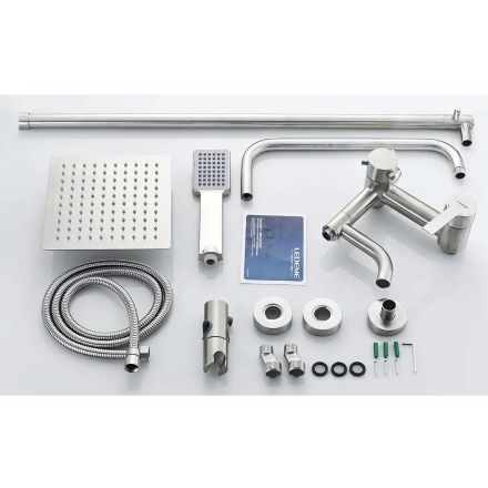 | Комплектация | смеситель, душевая стойка, верхний душ, душевая лейка, душевой шланг, держатель для душевой лейки, настенный держатель, отражатели, эксцентрики |