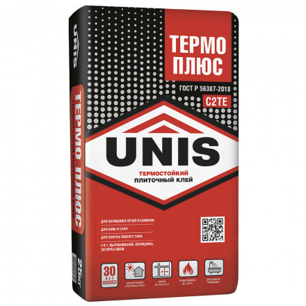 Клей для плитки Unis Термо Плюс термостойкий плиточный клей для различных нагреваемых поверхностей: системы «Тёплого пола», внешних поверхностей печей и каминов. Клей обеспечивает надежное клеевое соединение при постоянном воздействии температуры +150 °С и выдерживает кратковременный нагрев до +250 ºС. Клей «ТЕРМО ПЛЮС» предназначен для укладки всех видов керамической плитки, клинкерной плитки, плит из природного камня и керамогранита малого и среднего формата на полы, стены в любых помещениях: влажных, сухих, промерзающих и отапливаемых. Подходит для облицовки фасадов зданий. Клей может использоваться для затирания швов.