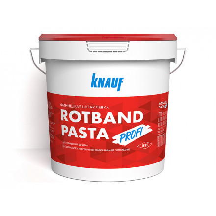 Готовая пастообразная финишная шпаклёвка на виниловой основе. Обладает повышенной белизной, адгезией и трещиностойкостью. КНАУФ-РОТБАНД ПАСТА ПРОФИ применяется внутри помещений для финишного шпаклевания поверхности гипсокартонных или гипсоволокнистых листов, оштукатуренных и бетонных поверхностей, пазогребеневых плит, стеклохолста при подготовке под высококачественную окраску, оклейку обоями, перед нанесением венецианской штукатурки и других финишных материалов.