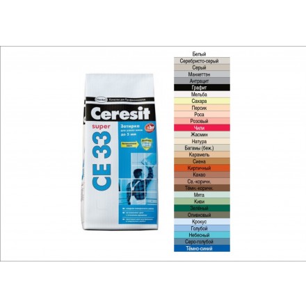 Затирка CE 33 предназначена для заполнения швов керамических и каменных облицовок, устроенных на недеформирующихся основаниях (таких как бетон, цементные стяжки и штукатурки), на полах и стенах внутри и снаружи зданий, при ширине шва до 6 мм. Может применяться в небольших крытых бассейнах.